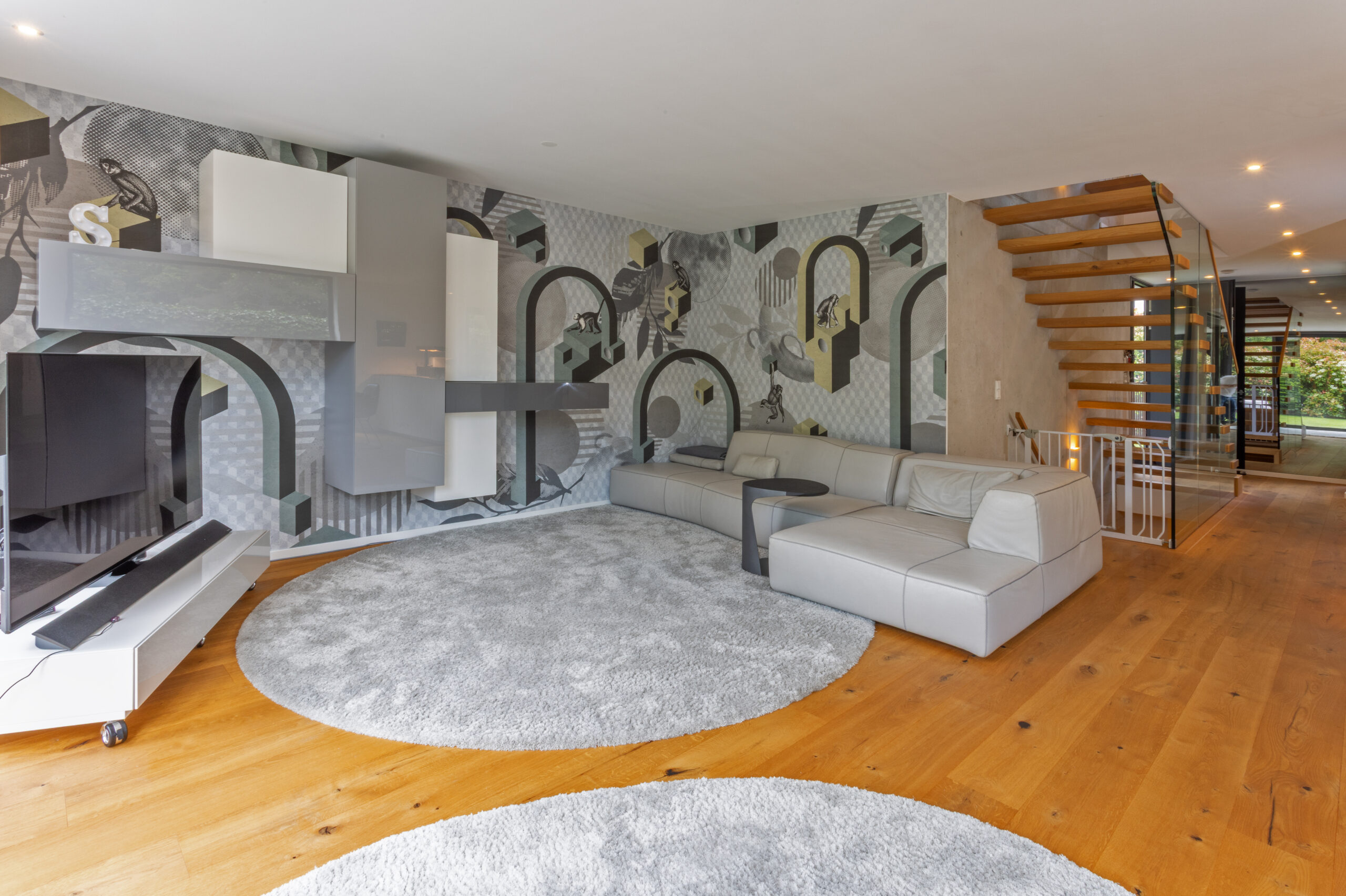 Einfamilienhaus mit ca. 215 m² Wohnfläche auf einem 480 m² großen Grundstück direkt an der Würm in Gräfelfing. Moderne Architektur mit klarer Linienführung und lichtdurchfluteten Räumen. Besonderheiten sind die Außentreppe mit separatem Zugang zum Aupair-Zimmer sowie die markante glastragende Kragarmtreppe im Inneren. Statt Pool steht hier die ruhige Lage am Wasser im Mittelpunkt – ein Zuhause mit urbaner Eleganz und naturnaher Atmosphäre.